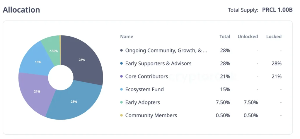 - Số Lượng Token Mở Khóa: 161.7 triệu PRCL (16.2% tổng cung)