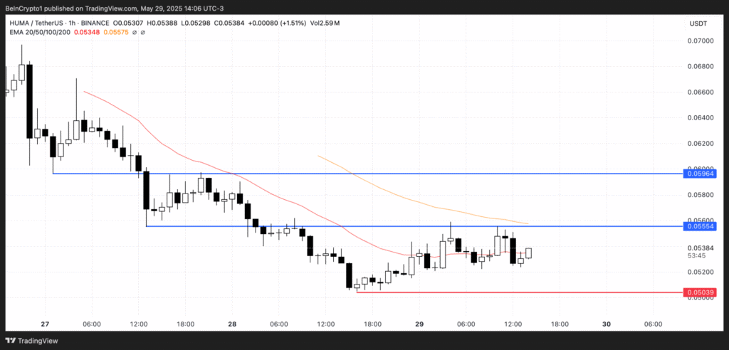 Mặc dù đã huy động thành công hơn 46 triệu USD và dự kiến thực hiện một airdrop thứ hai là 2.1% tổng cung ngay sau TGE (Token Generation Event), nhưng sự tham gia từ thị trường lại ở mức khiêm tốn. HUMA đã giảm hơn 51% chỉ trong ba ngày đầu sau airdrop, cho thấy rằng sự hỗ trợ mua từ phía cộng đồng đang còn hạn chế. Nếu tiếp tục xu thế giảm, giá có thể tụt xuống dưới 0.0503 USD. Tuy nhiên, trong trường hợp giá thị trường lật ngược tình thế và tìm được hỗ trợ vững chắc, HUMA có thể phục hồi và thử thách kháng cự tại 0.055 USD, và có thể tiến xa hơn lên tới 0.0596 USD.