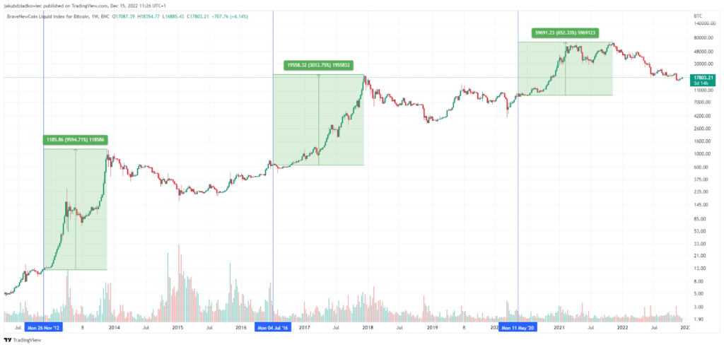 Trong giai đoạn downtrend sắp đến hồi kết (cuối năm 2023), chỉ số nonfarm bắt đầu tăng dần từ 105,000 lên 336,000, chứng tỏ nền kinh tế có sự tăng trưởng. Như đề cập ở trên, giai đoạn này Bitcoin đã tăng vọt từ 26,000 USD lên 42,000 USD.