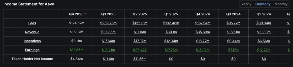 Trong quý hiện tại, tổng phí giao dịch của Aave đã vượt mốc 124,59 triệu USD, chỉ sau hơn một tháng bắt đầu quý mới. Sự tăng trưởng liên tục này cho thấy nền tảng vẫn duy trì sức hút đối với người dùng, đồng thời củng cố niềm tin của các nhà đầu tư dài hạn.