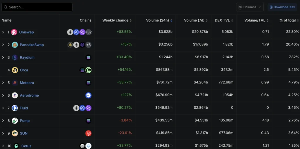 Không chỉ Aave, Uniswap, một trong những sàn giao dịch phi tập trung (DEX) lớn nhất, cũng đã đạt được những cột mốc đáng chú ý. Ngày 12/05/2025, Uniswap công bố khối lượng giao dịch mọi thời đại vượt qua 3 nghìn tỷ USD, cho thấy sức hấp dẫn mạnh mẽ của DeFi. Theo dữ liệu từ DeFiLlama vào ngày 14/05/2025, Uniswap đã xử lý hơn 3.6 tỷ USD giao dịch trong 24 giờ, chiếm 24% tổng khối lượng giao dịch DEX toàn cầu, củng cố vị thế thống trị của mình trong lĩnh vực DeFi.
