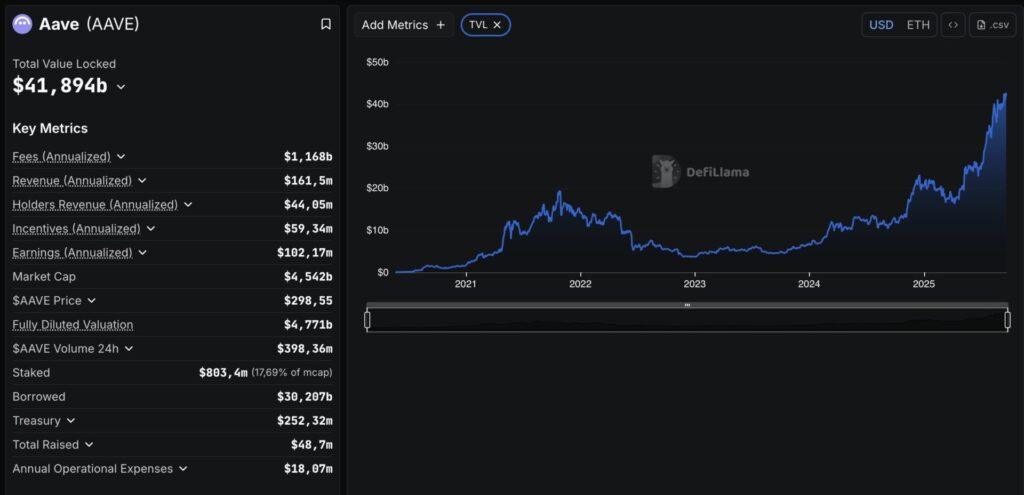 Bên cạnh việc đứng đầu về dư nợ cho vay, Aave còn cho thấy được sức hấp dẫn của mình thông qua tổng giá trị khóa (TVL) lên đến 42 tỷ USD. Số liệu từ DefiLlama cho thấy Aave hiện là giao thức DeFi lớn nhất thế giới xét theo chỉ số TVL. Nếu so sánh Aave với các ngân hàng thương mại truyền thống của Mỹ, quy mô tiền gửi của Aave sẽ tương đương với ngân hàng lớn thứ 53, nằm trong nhóm 2,5% ngân hàng hàng đầu tính đến ngày 30 tháng 6.