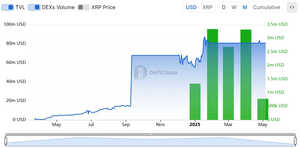 Ngoài ra, khối lượng giao dịch trên sàn giao dịch phi tập trung (DEX) cũng không khả quan hơn, giảm 16.94% từ 1 tỷ USD xuống 832 triệu USD. Dữ liệu từ DefiLlama còn chỉ ra rằng tổng giá trị bị khóa (TVL) trong hệ sinh thái XRPL vẫn ổn định ở mức khoảng 80 triệu USD trong năm 2025, trong khi khối lượng giao dịch hàng tháng trên DEX chỉ đạt gần 3.3 triệu USD, cho thấy sự không cân xứng trong vị thế của XRP—một trong những đồng tiền điện tử lớn nhất về vốn hóa thị trường.