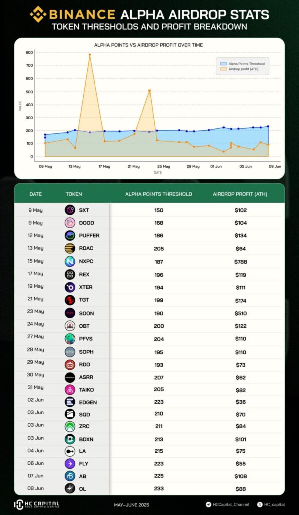 Tính đến thời điểm hiện tại, để nhận airdrop liên quan đến token Open Loot (OL), các nhà giao dịch cần đạt được 233 điểm Binance Alpha — mức điểm cao nhất từng ghi nhận. Báo cáo từ HC Capital cho thấy, điểm Binance Alpha đã có xu hướng tăng dần, từ 150 điểm vào tháng 5 năm 2024, và lên tới con số đáng kể hơn 200 điểm vào tháng 6 cùng năm.