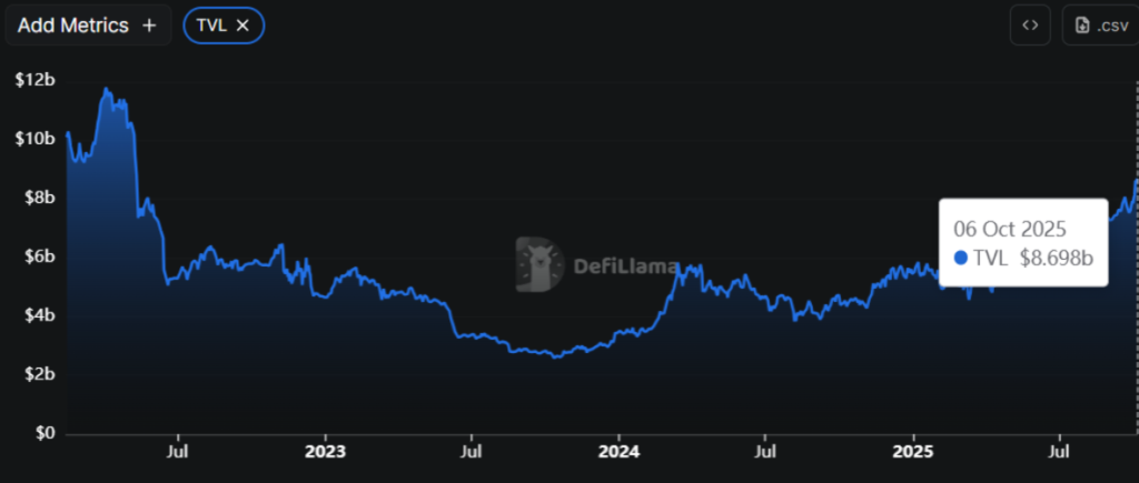- Tăng trưởng giá trị bị khóa (TVL): Tính đến ngày 2/10, tổng giá trị bị khóa trong hệ sinh thái BNB đã tăng từ 7,58 tỷ USD (ngày 27/9) lên 8,69 tỷ USD. Mức tăng này cho thấy dòng tiền đang chảy mạnh vào các dự án xây dựng trên BNB Chain.