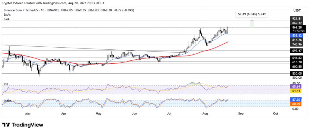 Các chỉ báo kỹ thuật hiện tại cũng hỗ trợ triển vọng lạc quan cho BNB: chỉ số sức mạnh tương đối (RSI) và Stochastic Oscillator (Stoch) đều đang tiếp cận vùng quá mua, cho thấy nhu cầu mạnh mẽ và áp lực tăng giá vẫn đang hiện diện.