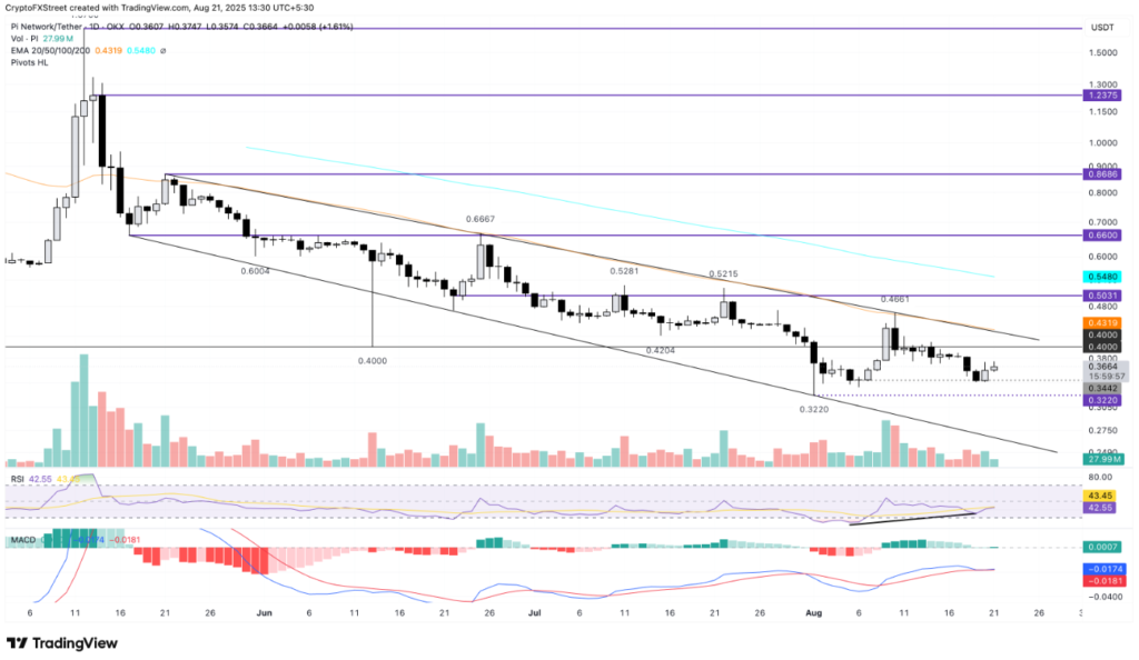 Pi Network (PI) đang trong giai đoạn phục hồi tích cực, với mức tăng nhẹ 1,50% vào cuối tuần, sau khi có một cú bật tăng mạnh mẽ 4,92% trong phiên giao dịch trước đó. Sự phục hồi này diễn ra từ vùng hỗ trợ $0,3442 và đang hình thành mô hình hai đáy, điều này được xác nhận lần đầu tiên vào ngày 6/8 với mục tiêu hướng tới đường EMA 50 ngày ở mức $0,4319.