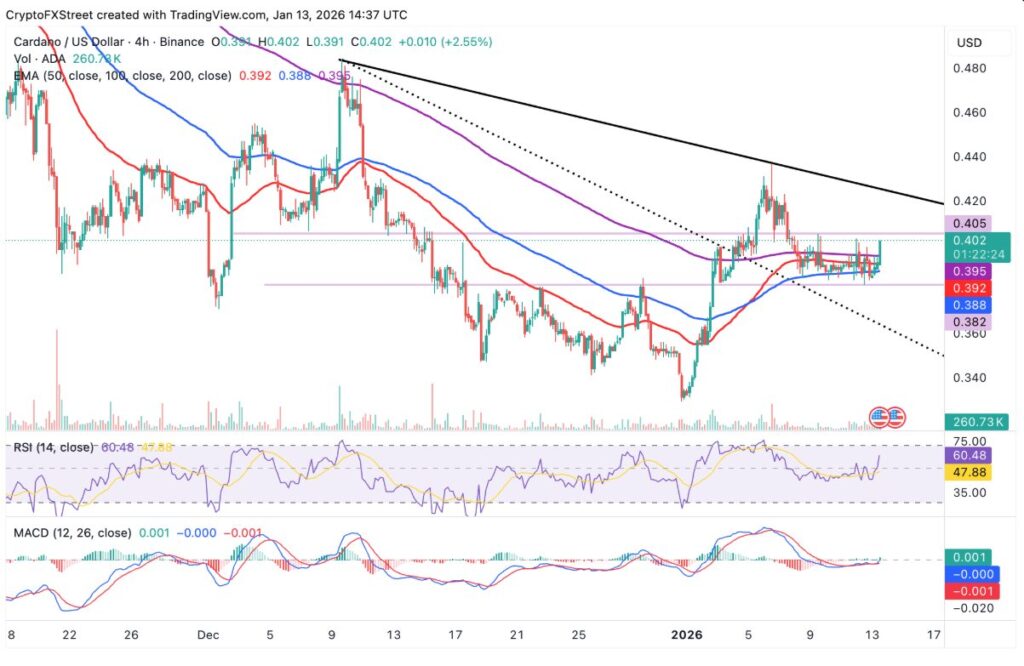 - Vùng hỗ trợ quan trọng: ADA vẫn duy trì vững vàng trên các đường trung bình động EMA 50 và EMA 100 quanh vùng 0,39 USD.