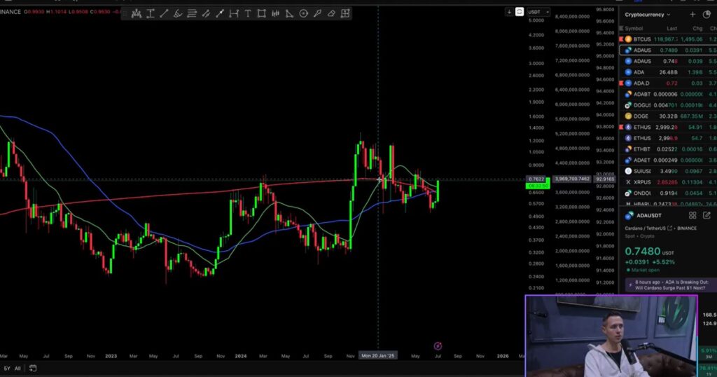 Trên khung thời gian tuần, Cardano đang thể hiện dấu hiệu bứt phá lên trên những đường trung bình động quan trọng sau một thời gian dài tích lũy. Trong suốt quá trình này, ADA đã nhiều lần va chạm với vùng kháng cự được cấu thành từ ba đường trung bình động chính — 20 tuần, 50 tuần và đặc biệt là 200 tuần, tạo nên một hệ thống kháng cự đa lớp đầy thách thức.
