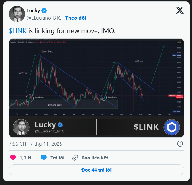 Trader Lucky nhận định rằng, nếu LINK vượt qua vùng kháng cự của kênh giảm này, giá có thể đạt tới mức 30 USD – tức hơn 110% so với giá hiện tại. Đặc biệt, vùng cầu mạnh từ 12 USD đến 15 USD chính là điểm kích hoạt các đợt tăng giá tiềm năng.