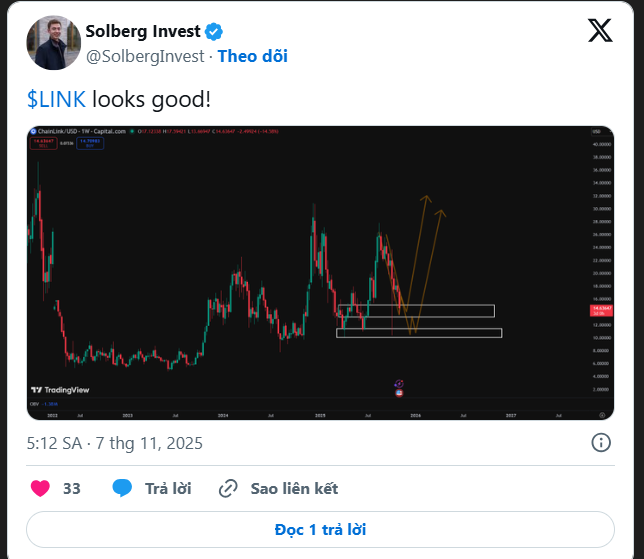 Ngoài ra, các phân tích khác cũng khẳng định rằng, nếu thị trường duy trì áp lực mua, LINK có thể tiến tới gần mức 33 USD trong thời gian không xa, đồng thời mở ra đợt tăng trưởng dài hạn.