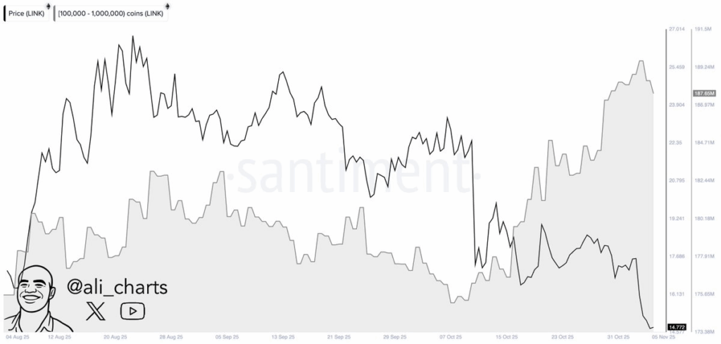 Hiện tại, giá LINK đang giao dịch quanh mức 15,44 USD, tăng 4,7% so với 24 giờ trước. Dù đã phục hồi từ vùng đáy gần 10 USD vào tháng 10, nhiều chuyên gia vẫn kỳ vọng vào một đợt tăng giá mạnh mẽ hơn nữa trong thời gian tới, dựa trên các tín hiệu kỹ thuật và hoạt động tích lũy của cá voi.