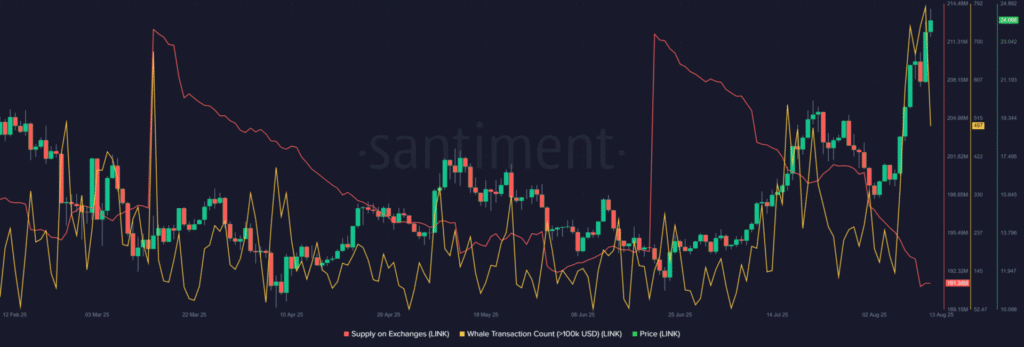 Mặc dù LINK đã vượt qua ngưỡng kháng cự, dòng chảy lợi nhuận thực tế vẫn duy trì ở mức thấp, dẫn đến hạn chế về thanh khoản bán ra. Thêm vào đó, hoạt động của cá voi ngày càng gia tăng với khoảng 713 giao dịch on-chain được ghi nhận mỗi ngày, cho thấy FOMO đang dẫn dắt đà tăng này.