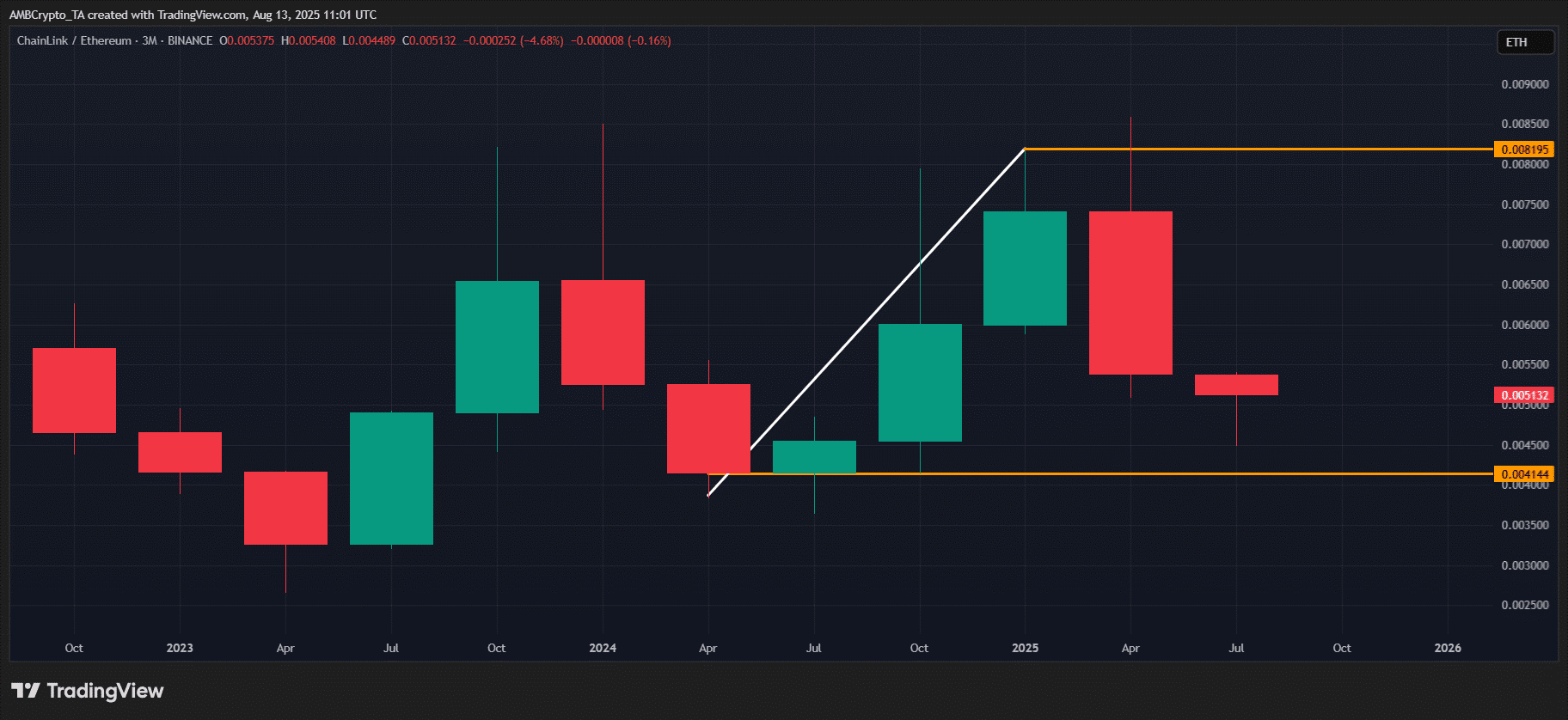 Điểm nhấn đáng chú ý nhất trong diễn biến của LINK chính là tỉ lệ LINK/ETH. Chỉ số này đang tiến sát đến ngưỡng hỗ trợ quan trọng trên khung tháng—a mốc mà trong quá khứ đã từng thúc đẩy LINK tăng hơn 82% trong quý 4, trong khi ETH chỉ tăng có 28%. Tình hình hiện tại này sẽ đóng vai trò then chốt trong việc chỉ dẫn bước đi tiếp theo của LINK.
