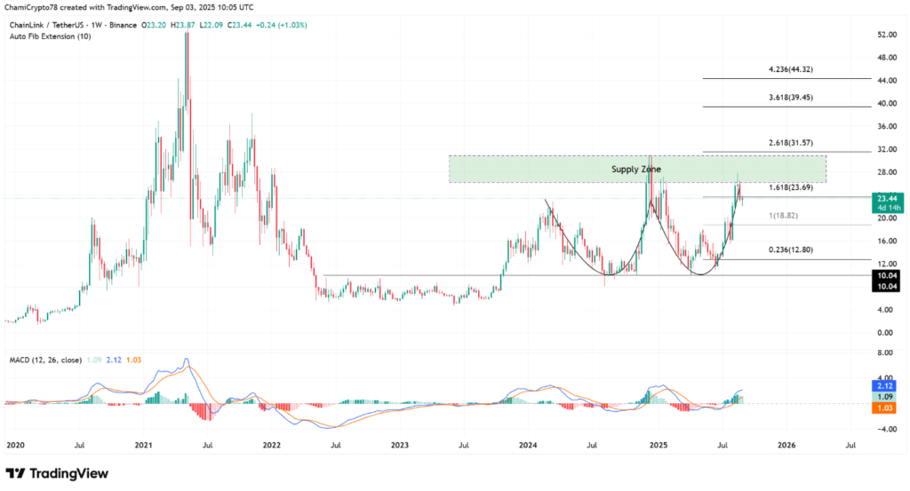 Biểu đồ giá tuần của Chainlink đang tiết lộ một mô hình đáy tròn, cho thấy xu hướng tích lũy kéo dài trước khi bước vào một giai đoạn tăng trưởng mới. LINK đã phá vỡ ngưỡng Fibonacci mở rộng tại 23,69 USD và đang kiểm nghiệm vùng kháng cự quan trọng ở mức 28–32 USD. Nếu đủ sức mua để vượt qua mốc này, LINK có thể mở rộng đà tăng lên các mức giá quan trọng tiếp theo, cụ thể là 31,57 USD, 39,45 USD và thậm chí có thể là 44,32 USD.
