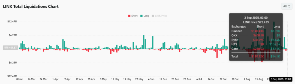 Dữ liệu từ thanh lý vị thế cho thấy rằng áp lực đang gia tăng lên phe short, với tổng cộng hơn 180.000 USD bị thanh lý chỉ trong một khoảng thời gian ngắn, trong khi con số thanh lý đối với các vị thế long chỉ khoảng 14.000 USD. Điều này cho thấy sự mất cân bằng mạnh mẽ, với điểm yếu rõ rệt của phe gấu, đặc biệt khi LINK vẫn giữ vững trên mốc 23 USD. Trong lịch sử, những làn sóng thanh lý vị thế short mạnh thường khiến cho lực mua đẩy giá đi xa hơn, tất cả tạo ra một hiệu ứng khuếch đại cho đà tăng của LINK.