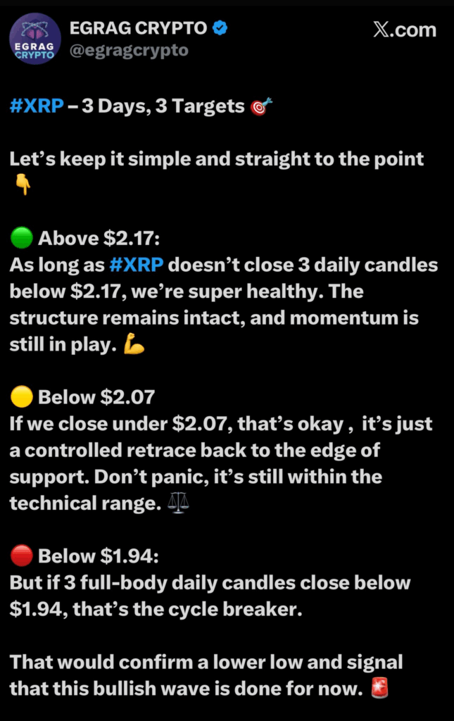 Đà giảm liên tục của XRP đã khiến nhiều nhà phân tích đặt câu hỏi về khả năng duy trì xu hướng tăng. Nhà phân tích EGRAG CRYPTO cảnh báo, nếu XRP tiếp tục giảm xuống dưới mức hỗ trợ $1,94, thì đó sẽ là tín hiệu rõ ràng cho việc phá vỡ chu kỳ tăng giá và xác nhận sự kết thúc của làn sóng tăng trưởng ngắn hạn.