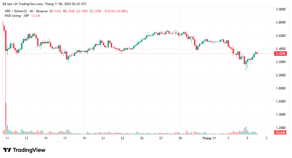 Trong những ngày gần đây, giá XRP đã ghi nhận mức giảm hơn 2% chỉ trong vòng 24 giờ, phản ánh tâm lý bán tháo của nhà đầu tư. Cụ thể, giá đã giảm từ mức đỉnh $2,37 xuống còn thấp nhất tại $2,08, trước khi có một chút phục hồi nhẹ. Tại thời điểm viết bài, giá XRP đang duy trì quanh mức $2,32, đồng thời khối lượng giao dịch tăng mạnh, lên đến $9,4 tỷ, tăng 23% so với ngày trước đó.
