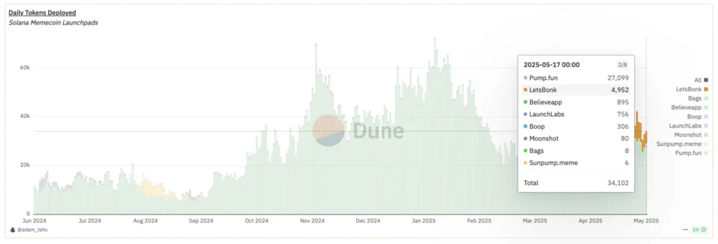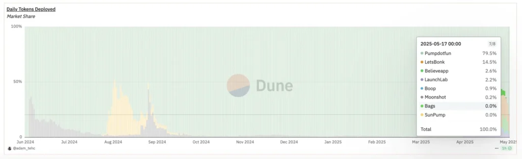 Mặc dù ứng dụng Believe đã gặt hái được một số thành công nhất định, nhưng cũng không thể phủ nhận rằng thị trường đang xuất hiện nhiều thách thức. Trong khoảng thời gian từ 13/05 đến 15/05/2025, Believe đã chiếm được 13.6% tổng số token mới trên các bệ phóng Solana, đây là mức cao nhất từ trước đến nay. Tuy nhiên, đến ngày 17/05, con số này giảm xuống chỉ còn 2.6%, chứng tỏ rằng sự cạnh tranh trong môi trường này đang gia tăng.