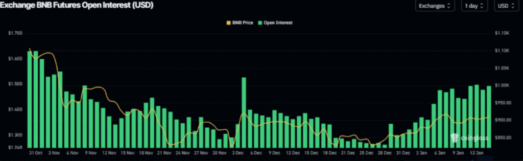 - Dữ liệu từ CoinGlass cho thấy hợp đồng mở của BNB đã tăng từ 1,30 tỷ USD (ngày 31/12) lên 1,50 tỷ USD vào thứ Ba, mức cao nhất kể từ đầu tháng 12.