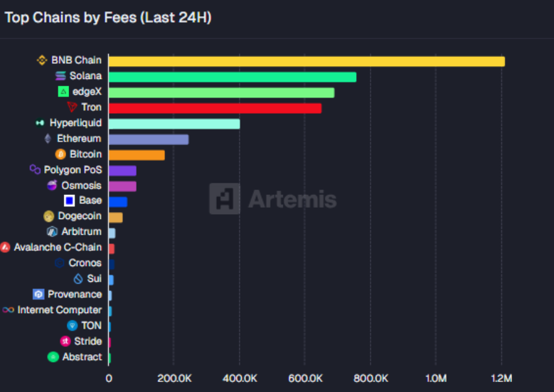 - Trong vòng 24 giờ qua, phí giao dịch trên BNB Chain đã đạt mức 1,2 triệu USD, đứng đầu trong các mạng lưới blockchain phổ biến như Solana hay edgeX.