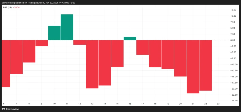 Ngoài ra, chỉ báo Elder-Ray cũng cung cấp cái nhìn sâu sắc về thị trường SOL. Chỉ số này hiện đang ở mức -20.74, cho thấy rằng người bán đang kiểm soát thị trường một cách mạnh mẽ. Chỉ báo Elder-Ray được tính toán bằng cách phân tích chênh lệch giữa giá của tài sản và đường trung bình động, cho phép người phân tích đánh giá động lực của cả phe mua và bán. Khi chỉ số này âm, nó cho thấy áp lực bán đang chiếm ưu thế, tương ứng với một bối cảnh thị trường mà giá liên tục giảm dưới mức trung bình.