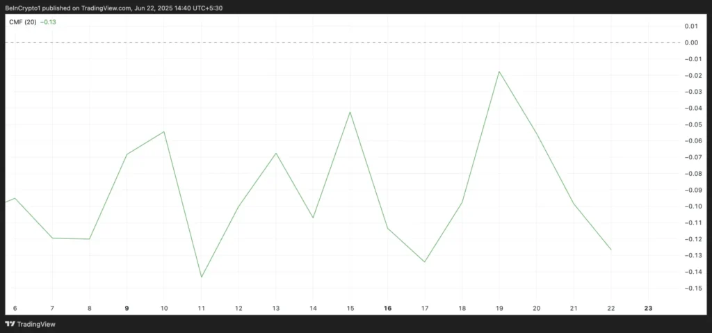 Khi CMF nằm trong vùng dương, điều này cho thấy khối lượng mua đang chiếm ưu thế, đồng nghĩa với việc dòng vốn đang chảy vào tài sản, cho thấy triển vọng tích cực của giá. Ngược lại, khi CMF chuyển sang vùng âm, điều này xác nhận rằng áp lực bán đang gia tăng, và nhu cầu đối với SOL đang suy yếu.