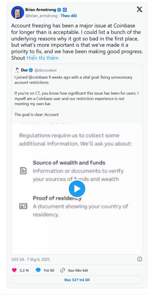 Brian Armstrong, Giám đốc điều hành của Coinbase, vừa công bố một mốc quan trọng trong việc giảm thiểu những trường hợp đóng băng tài khoản đáng tiếc. Ông cho biết rằng công ty đã thành công trong việc giảm tới 82% số lượng tài khoản bị hạn chế. Đây có thể được xem là một động thái tích cực, không chỉ cho người dùng cá nhân mà còn cho cả các doanh nghiệp sử dụng nền tảng này để giao dịch.
