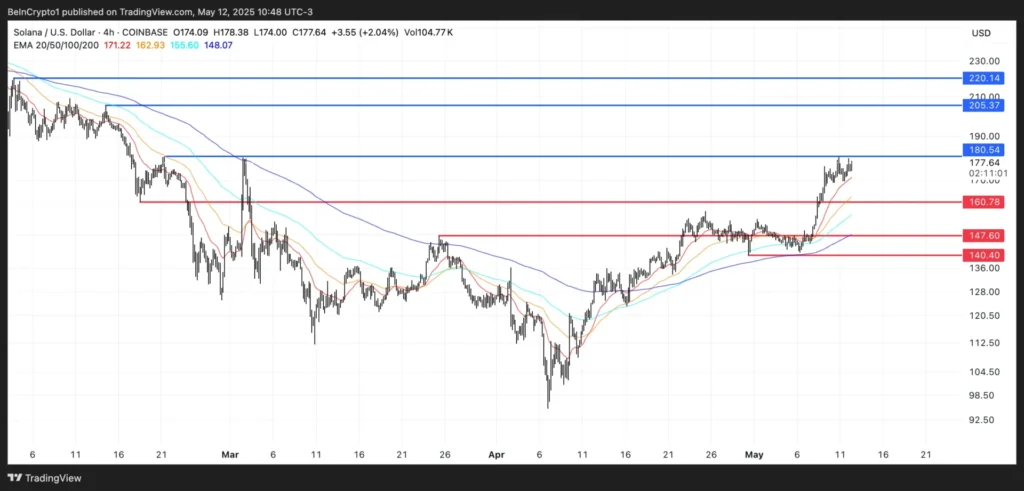 Giá hiện tại của SOL đang ở gần mức kháng cự 180.54 USD, điều này đã hạn chế sự tăng trưởng trong những phiên giao dịch vừa qua. Tuy nhiên, nếu SOL có thể vượt qua ngưỡng này và duy trì động lực, nó có khả năng leo lên mức 205 USD và đánh dấu lần đầu tiên vượt 200 USD kể từ ngày 10/02.