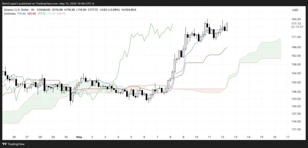 Chỉ báo Ichimoku Cloud hiện tại của Solana cho thấy một cấu trúc tăng giá rõ rệt. Các yếu tố bao gồm: