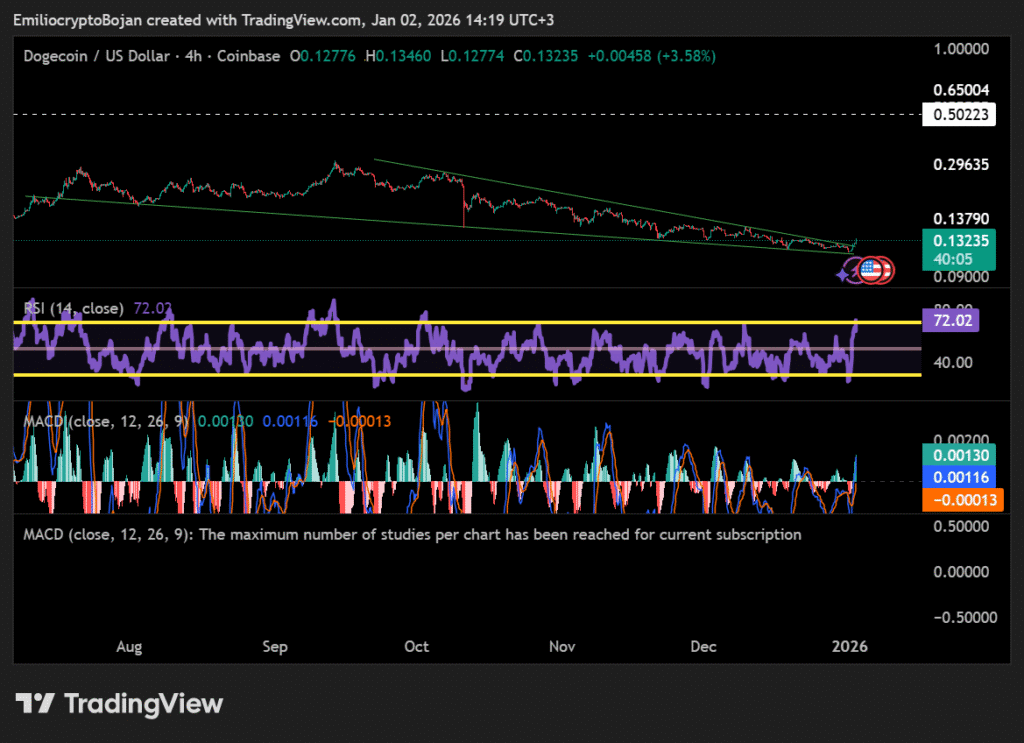 Hiện tại, giá DOGE dao động quanh mức 0,132 USD, với các chỉ báo kỹ thuật cho thấy động lực tăng còn mạnh. RSI tăng cao và MACD duy trì trạng thái tích cực cho thấy lực mua vẫn còn tồn tại trong ngắn hạn.