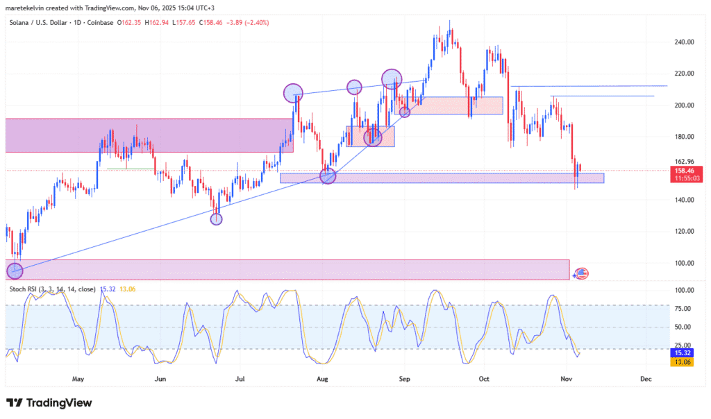 Trên biểu đồ giá hàng ngày, SOL hiện đang có dấu hiệu lấy lại đà tăng trưởng sau khi bật lên từ vùng hỗ trợ quan trọng quanh mức 150 USD. Đặc biệt, sự gia tăng dòng tiền vào ETF càng làm rõ hơn khả năng củng cố đà tăng của SOL trong ngắn hạn.