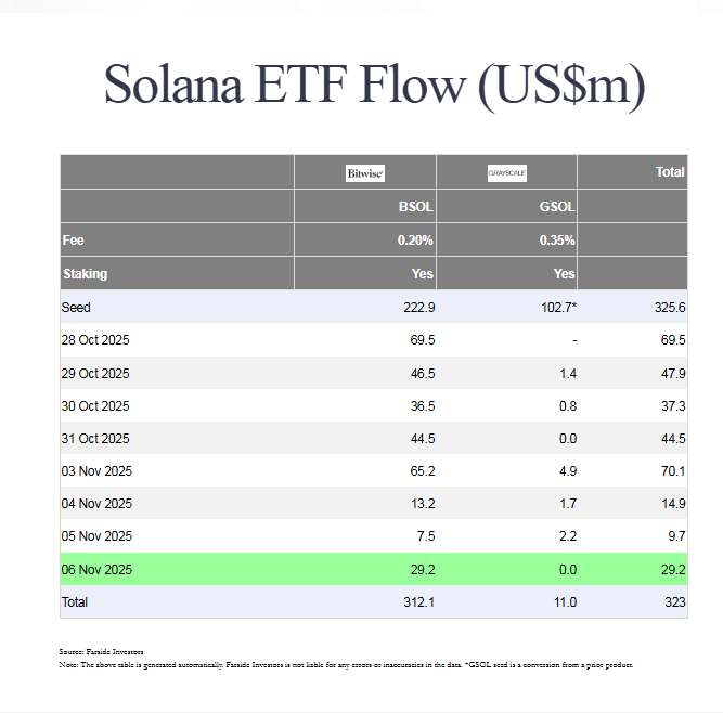 Theo báo cáo mới nhất từ công ty phân tích thị trường Farside, quỹ Grayscale $GSOL đã ghi nhận dòng tiền vào đạt 29,2 triệu USD, trong khi quỹ Bitwise $BSOL vẫn duy trì trạng thái ổn định không có thay đổi đáng kể. Tính từ thời điểm ra mắt, hai quỹ ETF lớn nhất dành cho Solana đã thu hút tổng cộng hơn 323 triệu USD, thể hiện mức độ quan tâm và kỳ vọng lớn của các nhà đầu tư tổ chức đối với dự án này.