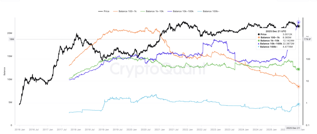 Các nhà đầu tư lớn, hay còn gọi là “cá voi” ETH, vẫn duy trì niềm tin vững chắc vào triển vọng tăng giá của đồng coin này. Theo số liệu từ CryptoQuant, các ví lớn sở hữu từ 10.000 đến 100.000 ETH đã tích lũy hơn 22 triệu token trong vòng sáu tháng qua. Ngược lại, các ví nhỏ lẻ và trung bình lại liên tục bán ra, dẫn đến xu hướng phân phối tài sản thay vì dòng tiền đầu cơ đổ vào các ví nhỏ.