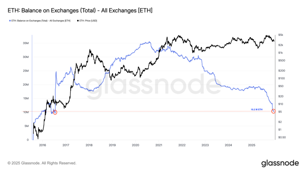 Dữ liệu từ Glassnode cho thấy, nguồn cung ETH trên các sàn giao dịch tập trung đã giảm mạnh tới 45% trong vòng sáu ngày qua, xuống còn 10,2 triệu ETH – mức thấp nhất trong chín năm. Điều này cho thấy, nhiều ETH đã được chuyển vào hợp đồng thông minh hoặc lưu trữ an toàn trong ví lạnh, hạn chế khả năng bán tháo và tạo ra nguồn cung sẵn sàng bán ra hạn chế.