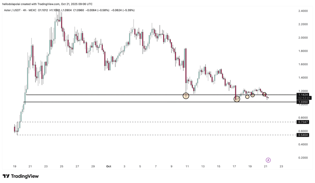 Tại thời điểm phân tích, ASTER đang giao dịch trong vùng cầu thấp, nằm trong khoảng từ $1,03 đến $1,14. Các dữ liệu lịch sử cho thấy, trong năm lần trước khi giá chạm vùng này, thị trường đều có xu hướng phục hồi rất hạn chế hoặc không phục hồi.