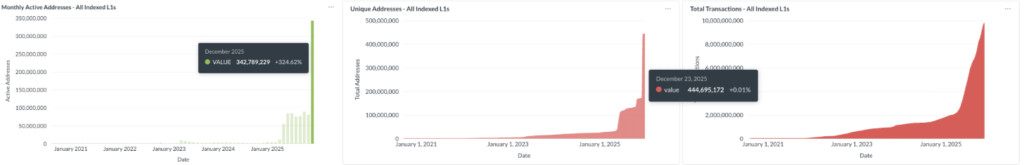 Tháng 12 vừa qua, Avalanche ghi nhận hơn 342 triệu lượt tương tác, vượt qua các mốc trước đó và đưa tổng số địa chỉ duy nhất trên mạng lên hơn 444 triệu. - Giao dịch tăng vọt: