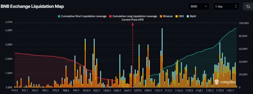 Trong thị trường phái sinh, các hoạt động thanh lý đóng vai trò quan trọng trong việc xác định xu hướng ngắn hạn của thị trường. Dữ liệu từ CoinGlass cho thấy các mức thanh lý lớn của BNB tập trung quanh các mức giá 1.009,5 USD và 1.106,1 USD. Các mốc này có thể đóng vai trò quyết định trong việc định hướng của giá trong thời gian tới.