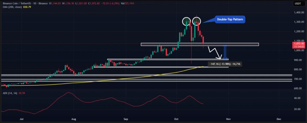 Theo phân tích của Coin Photon, BNB đang hình thành mô hình hai đỉnh (double-top) trên biểu đồ ngày, một mô hình mang tính chất giảm giá rõ rệt. Hiện tại, giá BNB đã tiến sát đường viền cổ ở mức 1.050 USD, đây là ngưỡng quyết định hướng đi tiếp theo của đồng coin này. Nếu không giữ vững vùng hỗ trợ này, BNB có khả năng sẽ trượt sâu hơn, kéo theo mức giảm khoảng 14%, về quanh mức 900 USD.