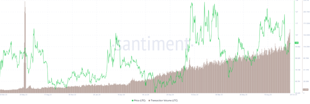Theo dữ liệu từ Santiment, khối lượng giao dịch của Litecoin đã tăng từ mức 127,31 triệu USD ngày 18/10 lên 157,94 triệu USD trong ngày thứ Hai, đạt đỉnh cao kể từ tháng 6 năm 2023. Sự gia tăng này phản ánh dòng tiền chảy mạnh vào mạng lưới LTC, cùng với sự quan tâm ngày càng lớn từ cộng đồng đầu tư.