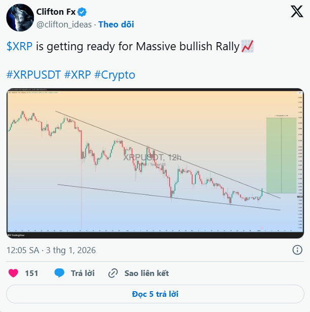 Theo chuyên gia phân tích thị trường tiền điện tử, ông BarriC, giai đoạn tăng trưởng của XRP vẫn còn ở phía trước và nhiều khả năng sẽ bùng nổ trong năm 2026. Ông dự đoán, đợt tăng giá tiếp theo có thể đưa XRP lên vùng 6 USD đến 10 USD, mở ra cơ hội lớn cho các nhà đầu tư dài hạn.