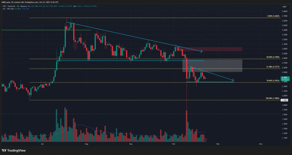 XRP hiện đang vận động theo mô hình các đỉnh thấp dần và đáy bằng nhau – một dạng mô hình tam giác giảm dần quen thuộc đã xuất hiện nhiều lần trong quá khứ. Trên biểu đồ ngày, vùng giá từ $2.5 – $2.77 (được tô sáng màu cyan) cho thấy còn tồn tại sự mất cân bằng, giảm khả năng bứt phá tăng giá trong ngắn hạn.