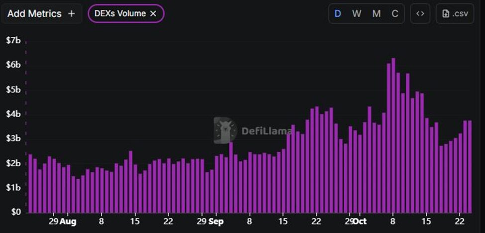 Cụ thể, ngày 18/10, khối lượng giao dịch DEX giảm xuống mức thấp nhất là 2,73 tỷ USD – mức thấp nhất kể từ đầu tháng. Tuy nhiên, kể từ thời điểm đó, hoạt động này đã bắt đầu khởi sắc trở lại, thể hiện qua mức khối lượng 3,76 tỷ USD trong vòng 24 giờ qua, cao nhất trong tuần.