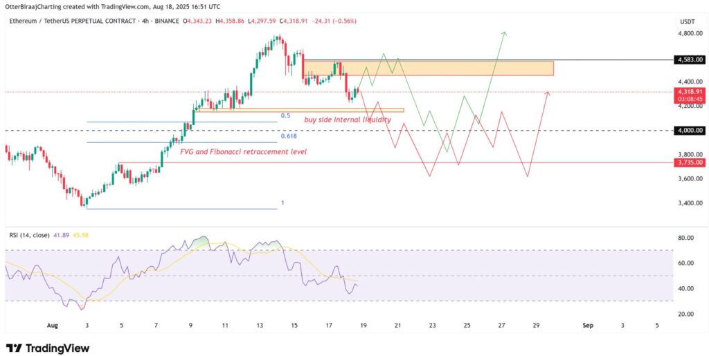 Về khía cạnh giảm giá, ETH đã thiết lập mức thấp nhất là 4.224 đô la và sự chú ý ngay lập tức chuyển hướng đến mức hỗ trợ 4.150 đô la. Mức hỗ trợ này được củng cố từ nhiều mức thấp thanh khoản trước đó. Ngay dưới mức hỗ trợ này, có một khoảng trống giá đáng kể quanh 4.000 đô la, nơi mà chỉ số Fibonacci chỉ ra khu vực hồi quy từ 0,50 đến 0,618, nằm giữa 4.100 và 3.900 đô la. Sự hội tụ của các yếu tố kỹ thuật này tạo ra một khu vực hấp dẫn cho các trader lướt sóng, thiết lập các lệnh mua.