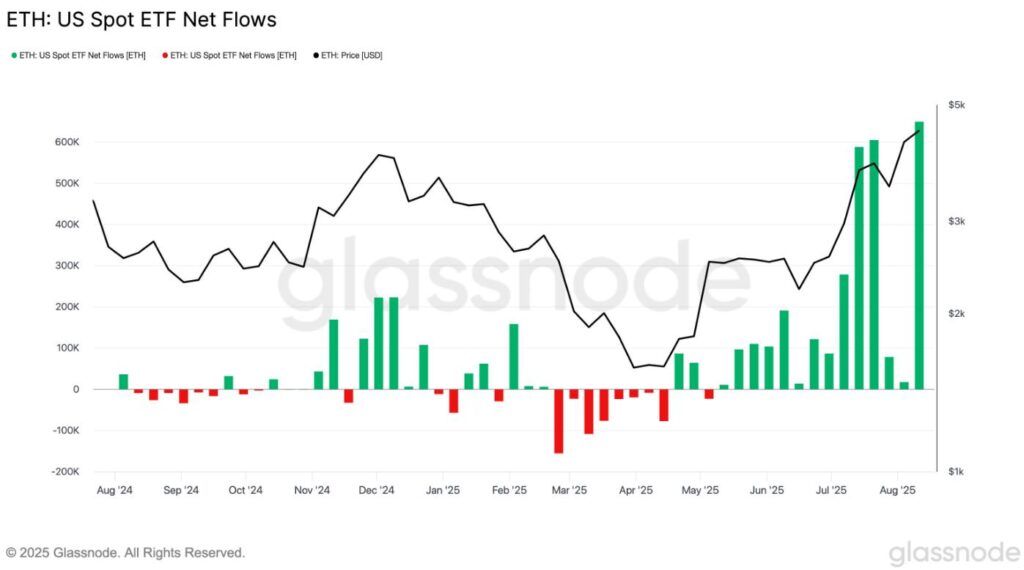 Trong tuần trước, các quỹ ETF Ether giao dịch tại Hoa Kỳ đã ghi nhận gần 649.000 ETH trong dòng vốn ròng, đánh dấu mức thu lớn nhất từ trước đến nay. Mặc dù ETH đã chạm mức 4.740 đô la trước khi giảm vào cuối tuần, động lực dòng vốn này nhấn mạnh nhu cầu tổ chức mạnh mẽ.