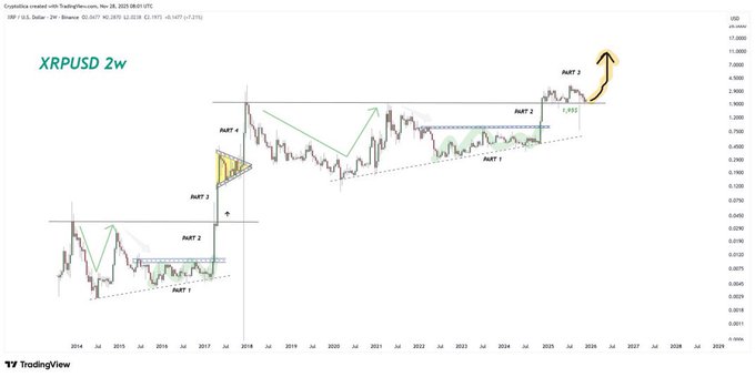 Chuyên gia Cryptofergani đã đưa ra nhận định dựa trên biểu đồ giá XRP trong khung thời gian hai tuần, cho thấy mô hình kỹ thuật lặp lại chính xác như trong chu kỳ tăng trưởng năm 2017. Cụ thể, XRP đã xây dựng một nền giá vững chắc, sau đó bứt phá mạnh mẽ, kiểm tra lại vùng hỗ trợ và tiếp tục củng cố để chuẩn bị cho đợt tăng mới.