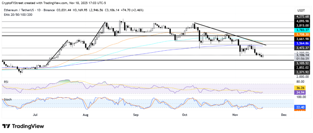 Sau khi giảm về mức đáy gần 2.950 USD, giá Ethereum đang cố gắng duy trì đà phục hồi quanh mức 3.100 USD. Đây là mức hỗ trợ quan trọng, nếu phe bò thành công bảo vệ mức này, khả năng cao ETH sẽ tiếp tục tăng để kiểm tra các ngưỡng kháng cự tiếp theo như 3.470 USD.