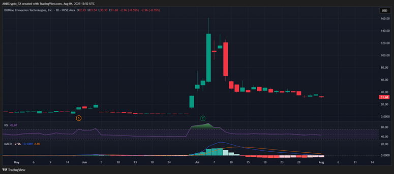 Vậy nhu cầu từ bên nào đang chiếm lĩnh thị trường? Gần đây, BitMine đã công bố nắm giữ 833.000 ETH, tương đương với khoảng 2,9 tỷ USD, trở thành kho bạc ETH lớn nhất thế giới. Trong khi cổ phiếu của BitMine (BMNR) đang gặp biến động mạnh và đã giảm xuống còn 31 USD gần đây.
