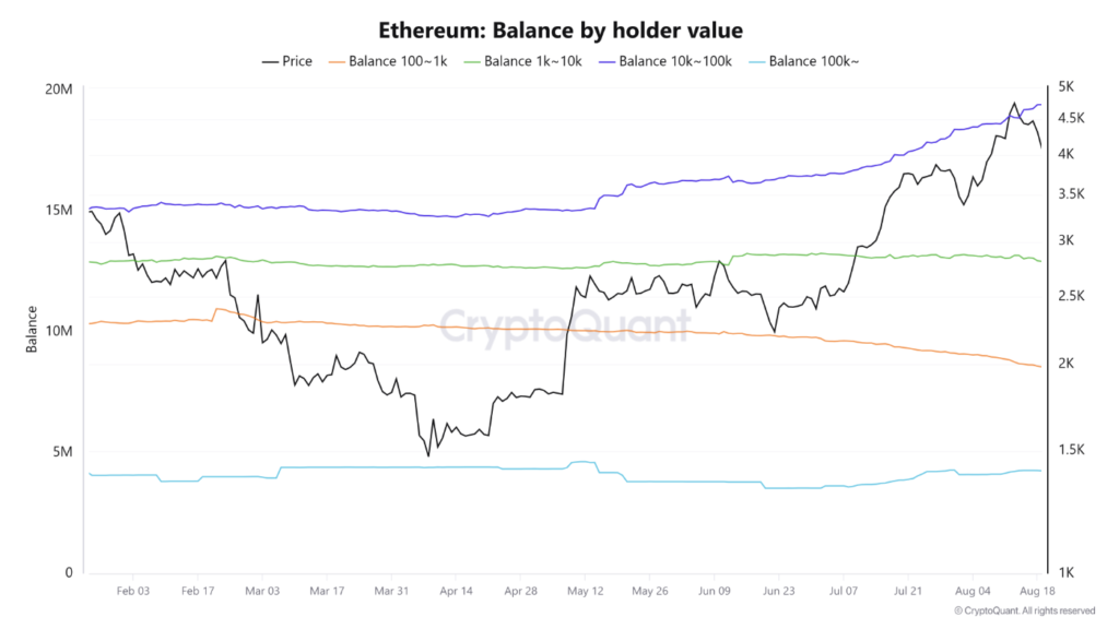 Đà tăng của Ethereum càng được củng cố nhờ sự kiên trì từ các nhà đầu tư lớn. Trong một tuần qua, nhóm nắm giữ từ 10.000 đến 100.000 ETH đã bổ sung khoảng 550.000 ETH vào danh mục của họ, bất chấp sự sụt giảm 10% về giá. Ngược lại, trong cùng giai đoạn, các nhà đầu tư nhỏ lẻ lại khá thiếu kiên nhẫn và đã bán ra hơn 380.000 ETH.