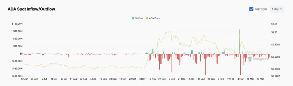 Dòng tiền ra này phản ánh tâm lý không mấy khả quan của các nhà đầu tư, khi họ chọn rút vốn do dự đoán về xu hướng giảm giá tiếp theo hoặc tìm kiếm cơ hội đầu tư ở những tài sản khác. Xu hướng này không chỉ cho thấy sự giảm sút trong niềm tin của các nhà giao dịch vào ADA mà còn làm gia tăng áp lực bán cho đồng tiền này.